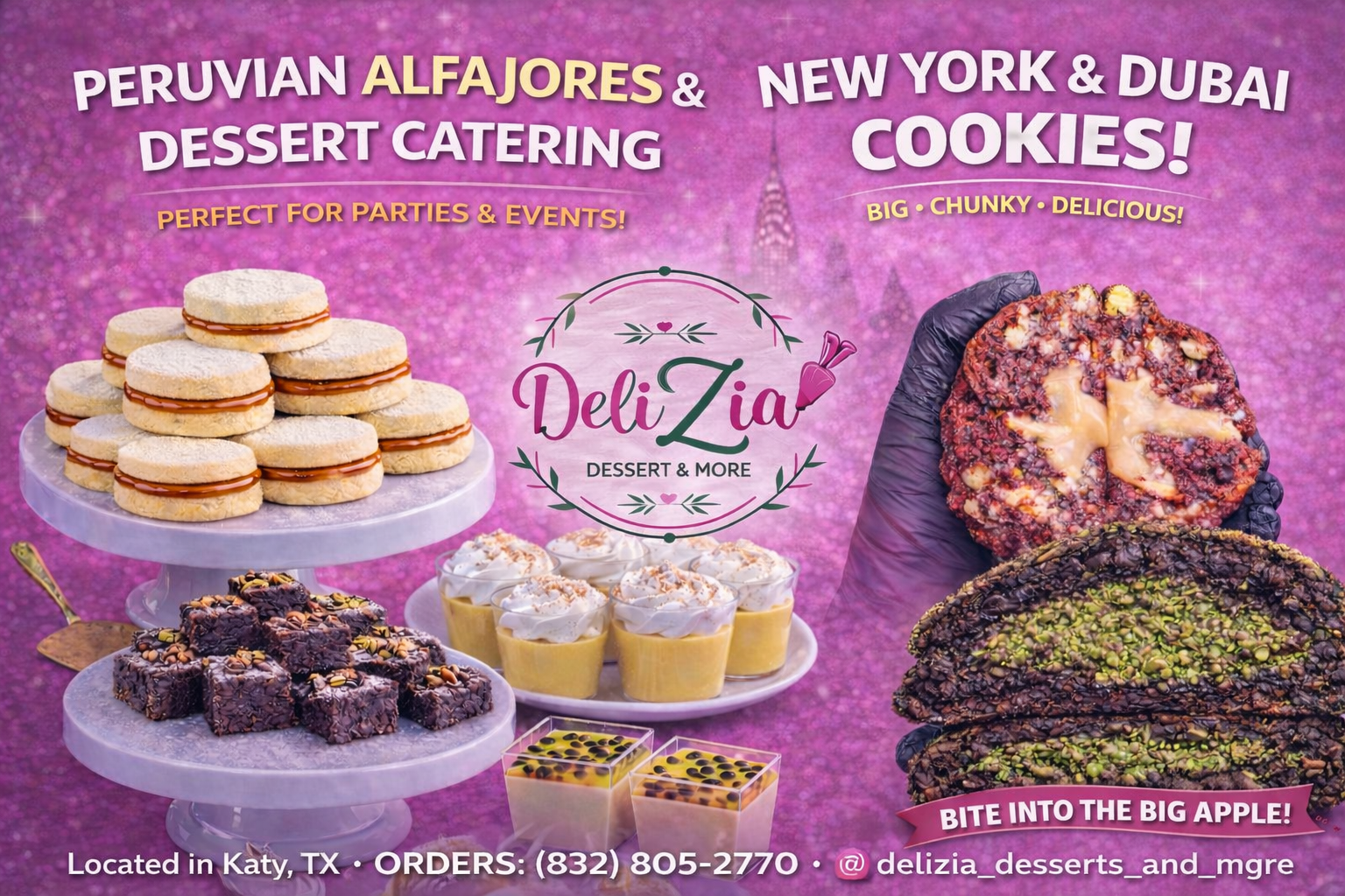 Tu destino para postres artesanales únicos en Houston, Texas. Descubre nuestros alfajores peruanos, galletas estilo New York, galletas Dubai y mucho más. Cada postre está hecho con amor y los mejores ingredientes.