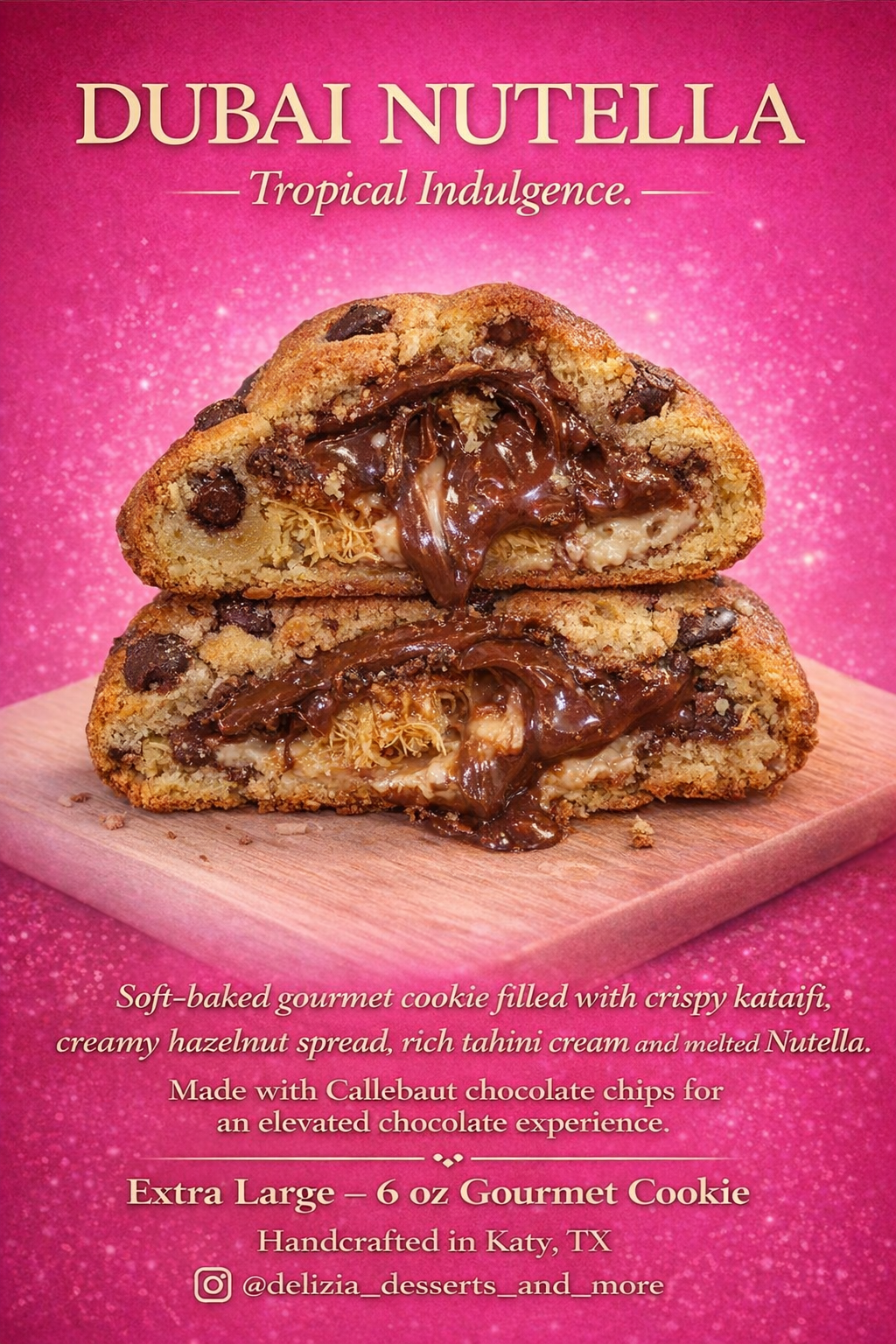 Galleta gourmet extragrande, suave por fuera y explosiva por dentro, rellena con Nutella derretida, crema de avellanas, y una delicada capa de crema de tahini. su toque especial lo da el crujiente Kataif, que aporta una textura unica, junto con chips de chocolate Callebaut que elevan cada bocado a una experiencia intensa, cremosa y perfectamente balanceada.